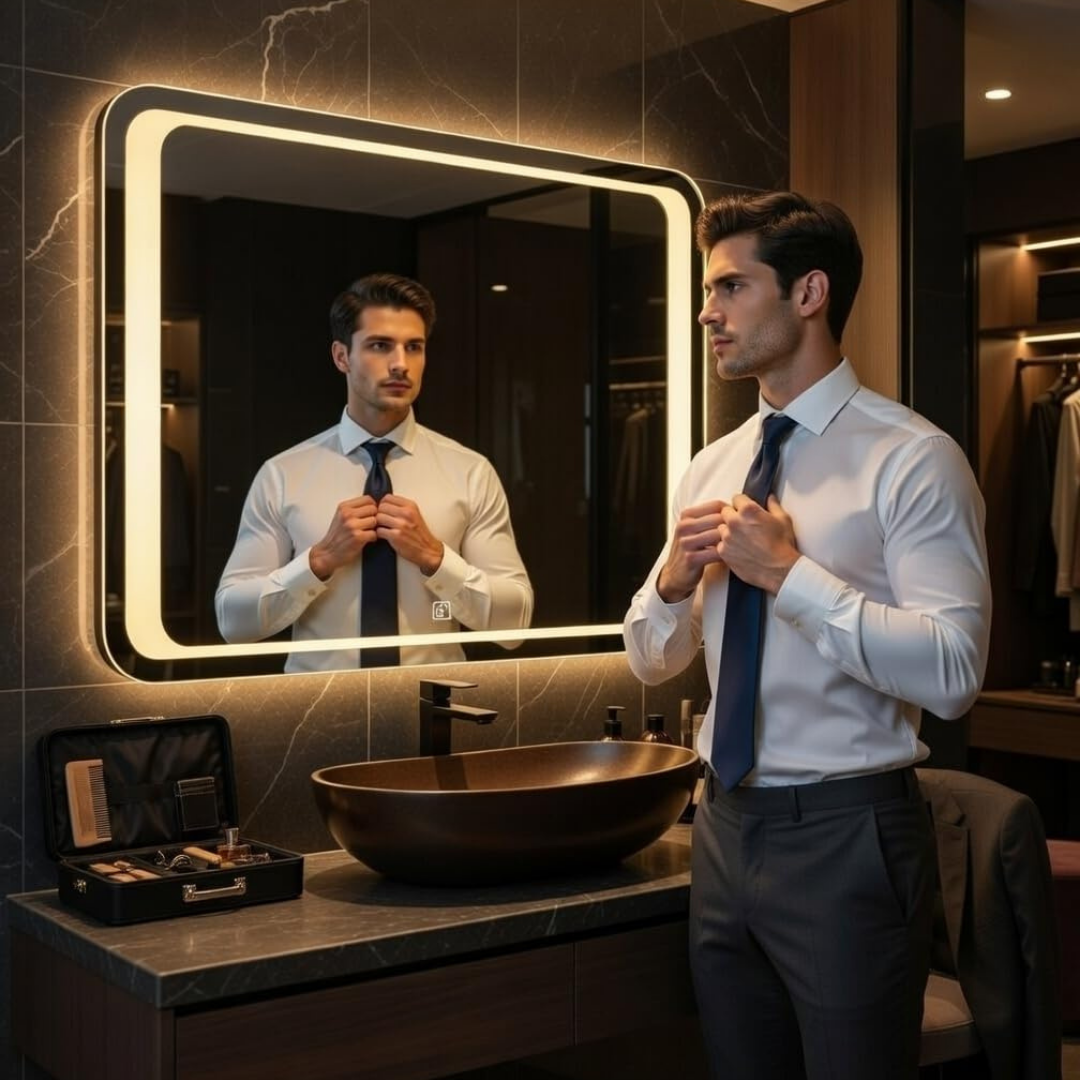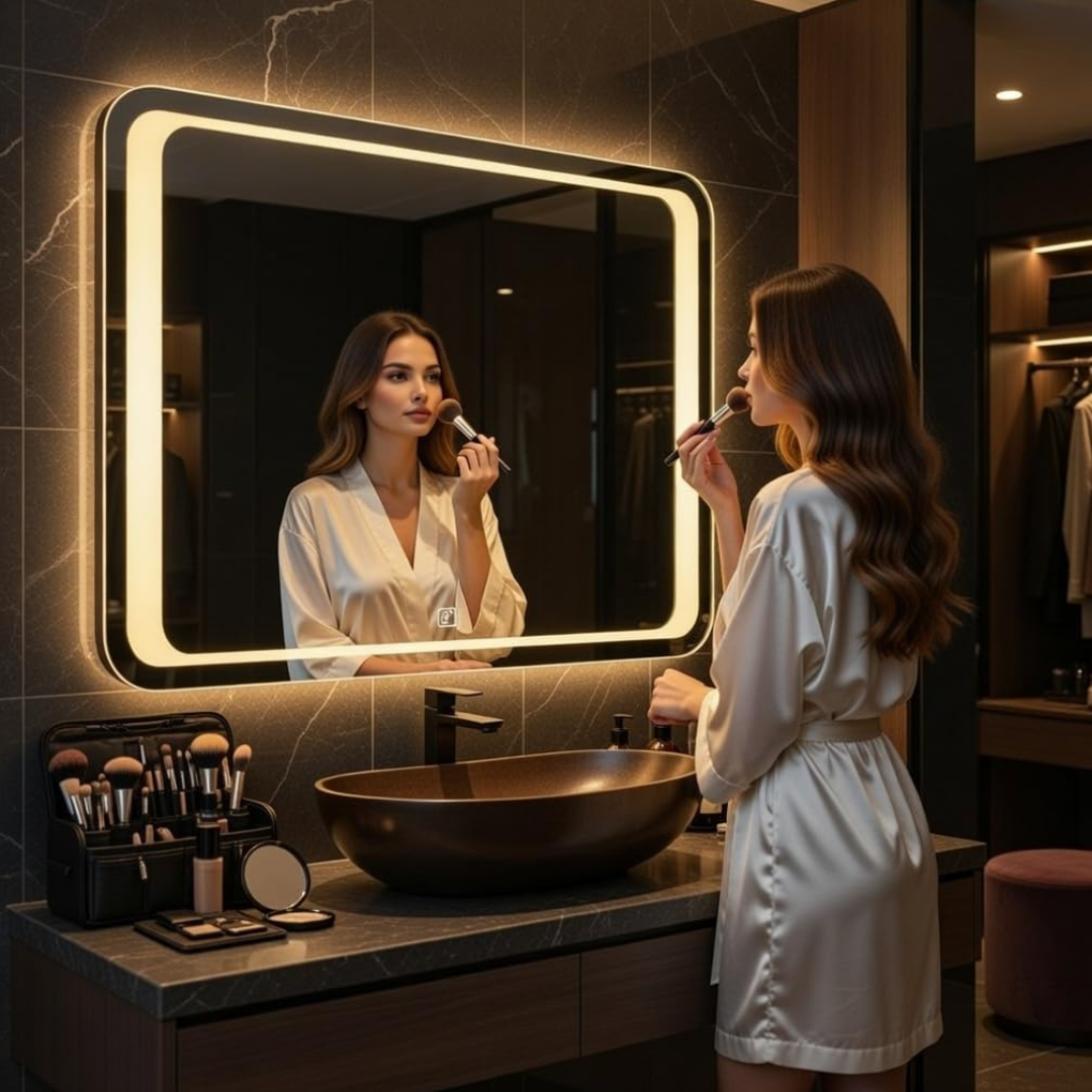 This stylish rectangular LED mirror features dual-tone ambient lighting that enhances the overall look of modern interiors. Designed with soft backlit illumination, it provides clear visibility for grooming while creating a warm and relaxing atmosphere. The sleek shape fits perfectly in bathrooms or vanity areas. Built with high-quality materials, it ensures durability and energy efficiency, making it a perfect blend of functionality and contemporary design.