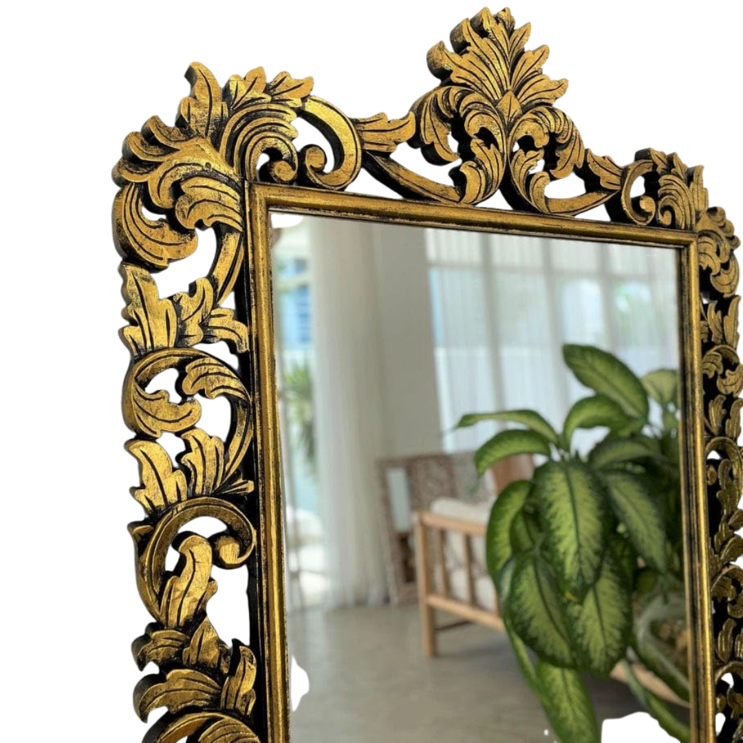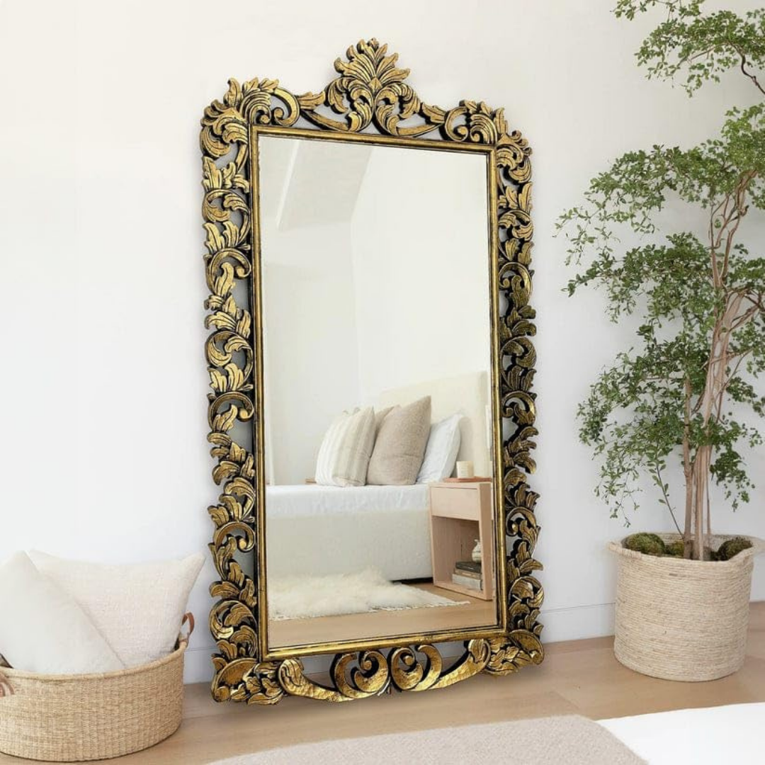 This premium designer mirror features an elegant vintage-style carved frame with a rich antique gold finish. The detailed design enhances the beauty of any interior, making it a perfect decorative and functional piece. Its full-length size offers a clear and wide reflection, ideal for bedrooms or dressing areas. Built with strong materials, it ensures durability while adding a luxurious and classic touch to your space.